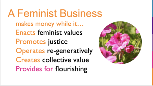 A feminist business has to be a sustainable, profitable business. It also has to promote justice. It has to operate regeneratively. It has to create collective value and, like a feminist economy, it’s got to provide for flourishing for all of us.