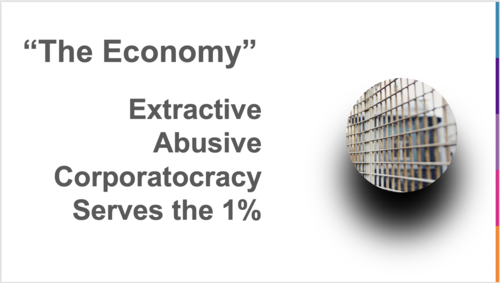 This economy is extractive and predatory: It takes more than gives back, it takes without restoring or regenerating. This economy is abusive. Working in this economy hurts us and causes us pain. This economy is a “corporatocracy”, where financiers and the elites at the top of our largest corporations set the economic agenda for the rest of us. These elites, and not us, get to decide what should get done, what should be made, and how we should define business success. They do this in ways that serve themselves, the 1%.