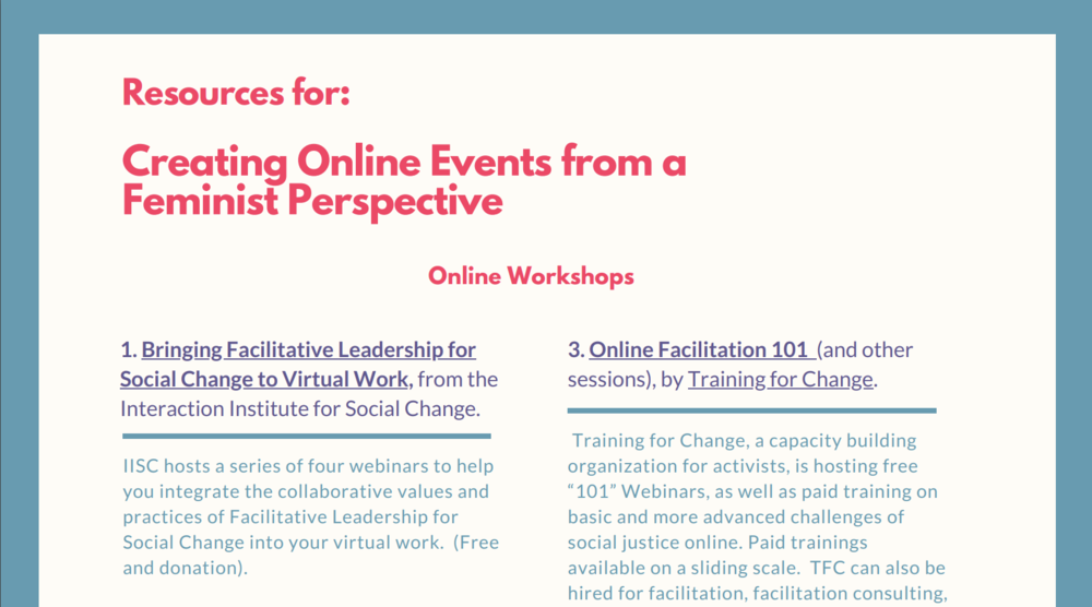 As part of my work to create some online events that are informed by feminist values and practices, I’ve put together a resource list of webinars and downloadable publications where you can learn more about how to translate feminist values and feminist facilitation methods into the online world of Zoom, GoToMeeting, and the like.